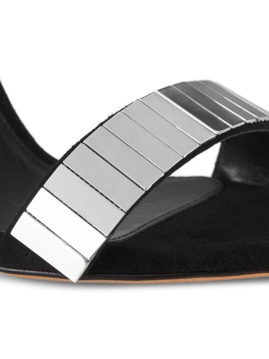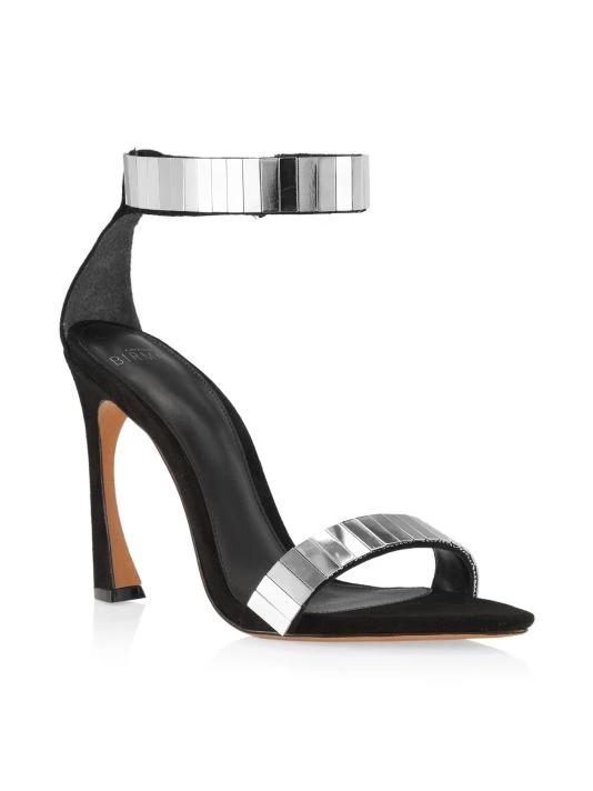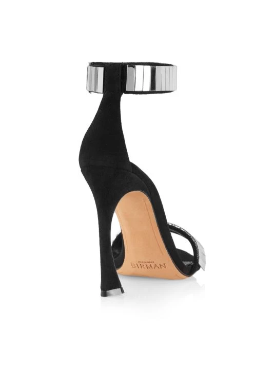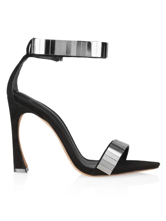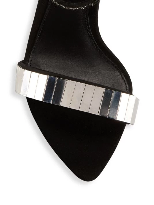 Highlighted with metal bar hardware, Alexandre Birman’s Anjelica sandals are crafted of rich suede. This pair is anchored by a curved heel.