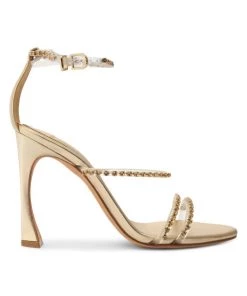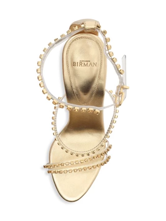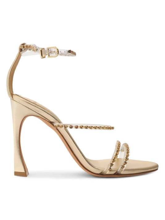 From the Dolores Collection. Sparkling Swarovski crystals adorn these high-heeled ankle-strap sandals.