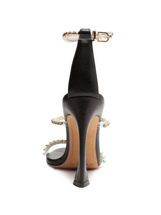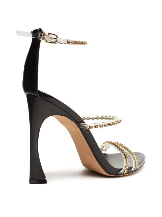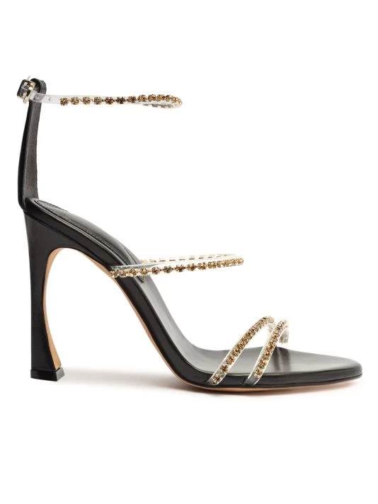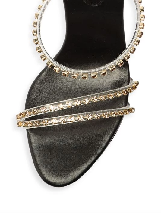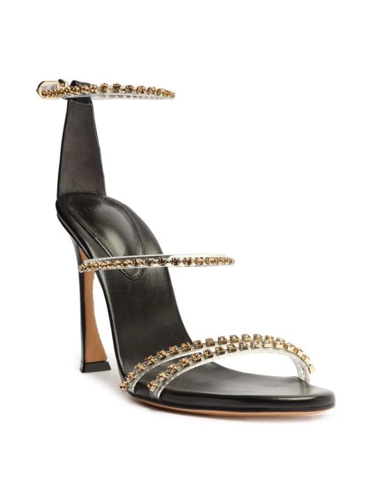 Mounted on a slightly slanted heel, these glamorous sandals feature transparent straps decorated with shimmering Swarovski crystals.