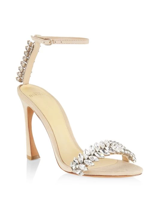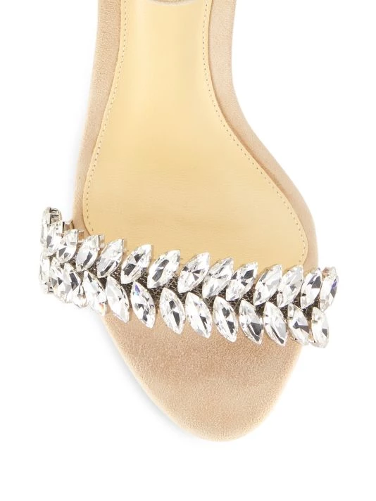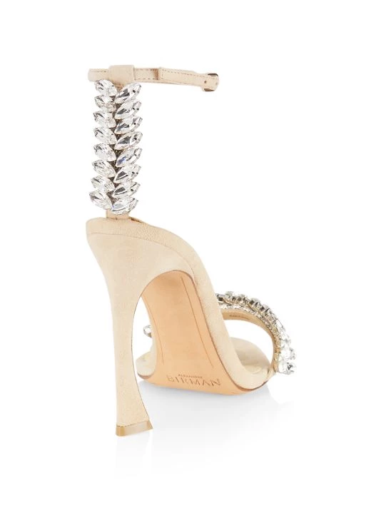 Highlighted with decorative crystals, Alexandre Birman’s Elina sandals are crafted of rich suede. This elegant pair is anchored by a curved stiletto heel.