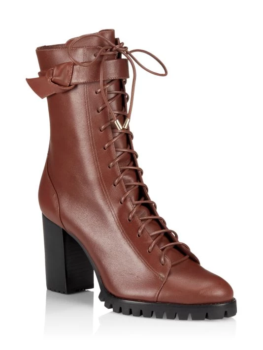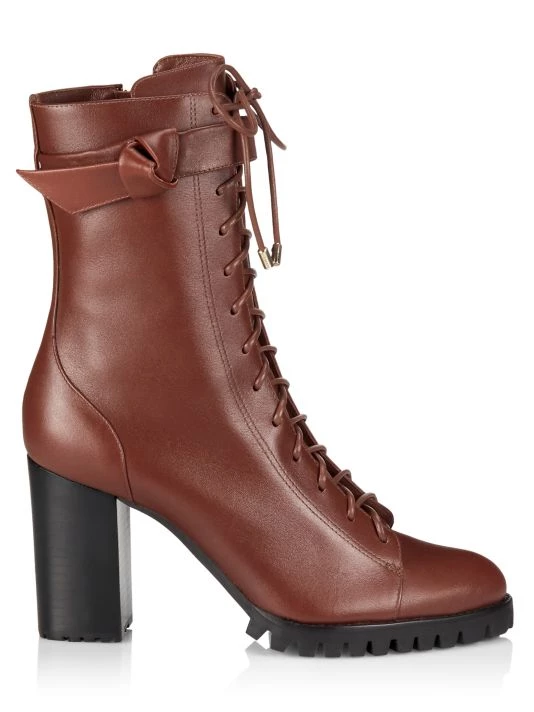 Mounted on a block heel, these waterproof leather boots are detailed with the signature bow strap that wraparound the ankle.