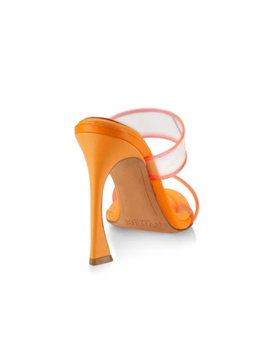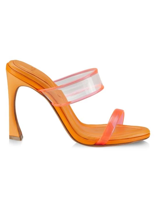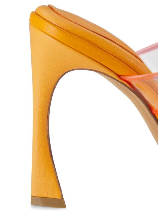 Anchored by a sculptural stiletto heel, this leather sandal is topped with vinyl straps.