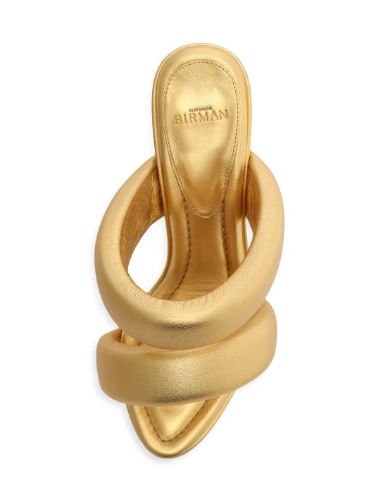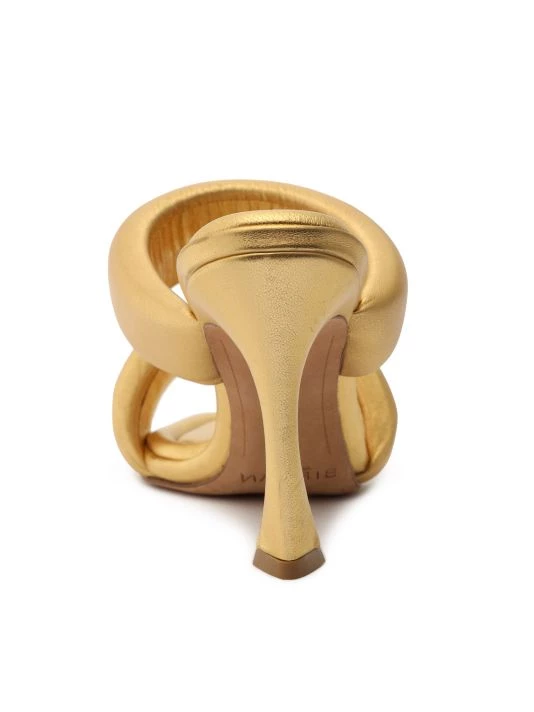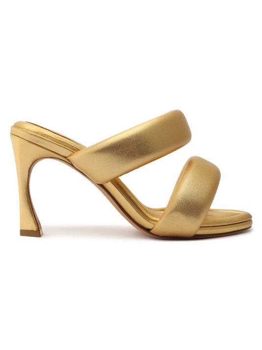 Padded straps add dimension to these metallic leather sandals, mounted on a slightly slanted heel.