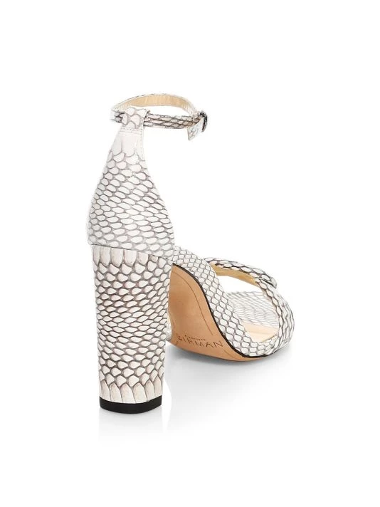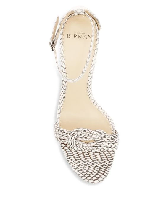 Allover snakeskin elevates ankle strap sandals with knotted strap and a high block heel.