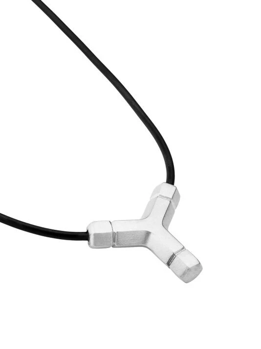 From the Bolt Collection. The piece is inspired by allen tools and takes the shape and basic geometries of the hexagon to create a triple point pendant rubber necklace. Since 1942, Tane is considered Mexico’s only truly world-class luxury brand, known for its contemporary handcrafted men’s and women’s jewelry in sterling silver, 23 karat gold vermeil, and 18 karat gold. The company has a rich and diverse heritage and is vertically integrated, ensuring sustainability from silver extraction to foundry, design and manufacturing.