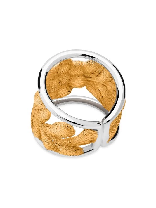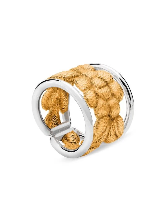 TANE offers a unique selection of gold and silver designs inspired by the brand’s cultural heritage. The Bordados Collection honors the artisan women of Oaxaca and their creative work with needle and thread. The patterns and textures captured in each piece are a look back in time, representing the original cultures of Mexico. This ring features a sterling silver frame filled with a gold vermeil floral design. A textured finish completes the look.