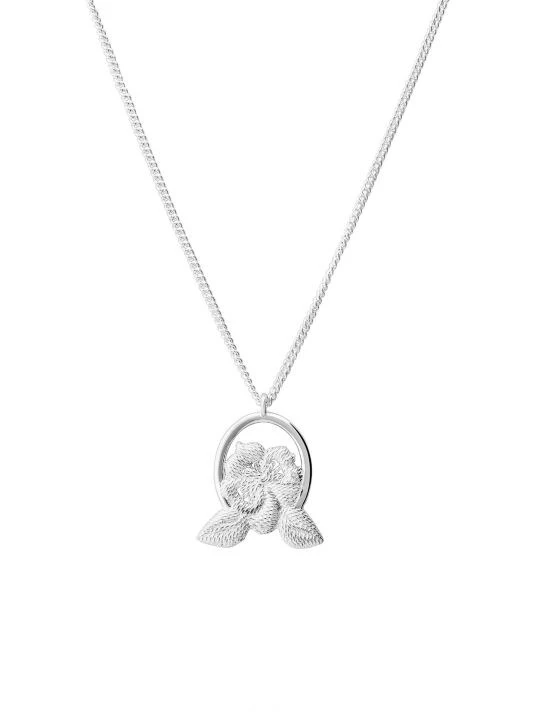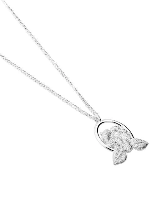 TANE offers a unique selection of gold and silver designs inspired by the brand’s cultural heritage. The Bordados Collection honors the artisan women of Oaxaca and their creative work with needle and thread. The patterns and textures captured in each piece are a look back in time, representing the original cultures of Mexico. This sterling silver chain necklace features a tropical flower drop pendant finished with a textured effect.