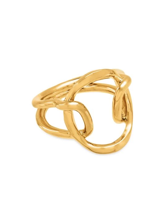 This ring features a round, interlocking shape crafted from 18k yellow gold.